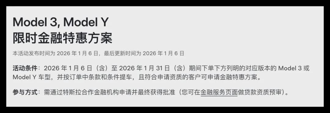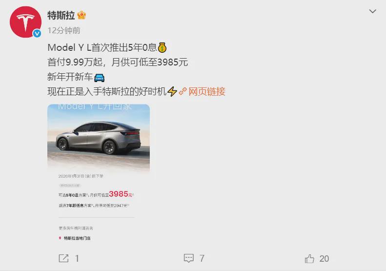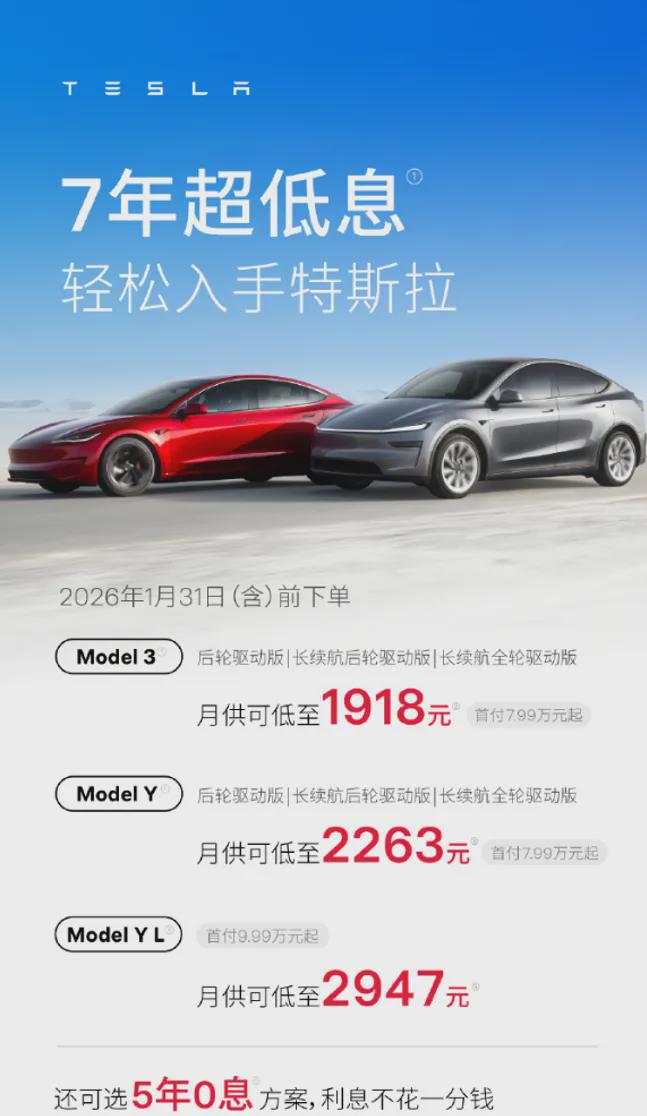 1月6日,特斯拉中国为购买Model 3和Model Y、Model Y L车型提供5年0息方案。