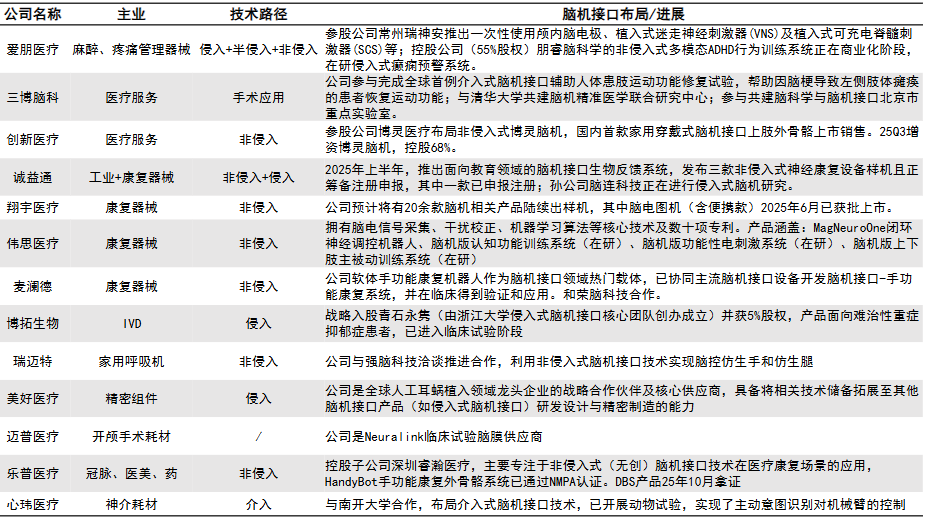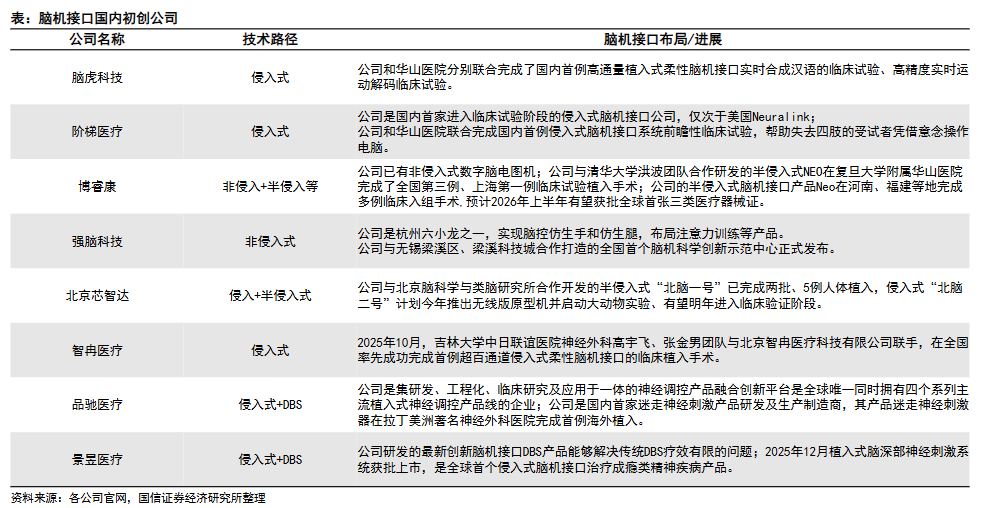 在侵入式与半侵入式领域,国内企业正密集开展临床试验。据国信证券梳理,阶梯医疗与华山医院合作,完成了国内首例侵入式脑机接口系统的前瞻性临床试验,受试者可通过意念控制鼠标;脑虎科技也完成了首例高通量柔性脑机接口实时合成汉语的临床试验。博睿康的半侵入式产品NEO预计将于2026年上半年获批全球首张三类医疗器械证。此外,心玮医疗与南开大学合作布局介入式技术,计划于2026年底完成首例人体植入。