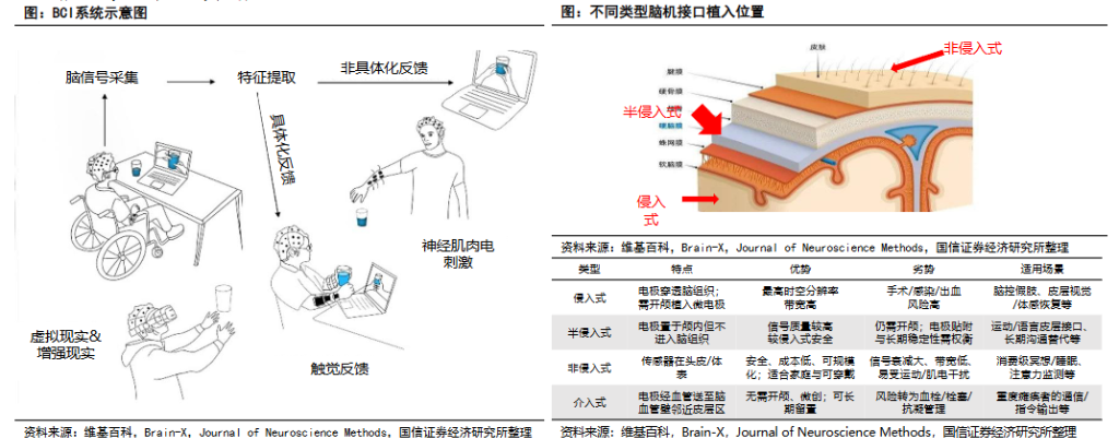 国信证券陈曦炳团队指出,脑机接口的核心在于大脑电活动与外部设备之间的通信链路,根据植入方式的不同,目前主要分为侵入式、半侵入式和非侵入式三大技术路线,各路径在信号质量、安全性和商业化周期上存在显著差异。