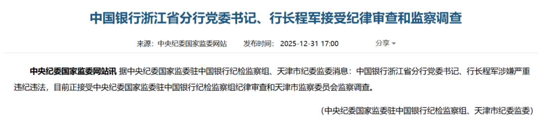 2025年的最后一天,官方通报中行浙江省分行党委书记、行长程军涉嫌严重违纪违法,正接受纪律审查和监察调查。