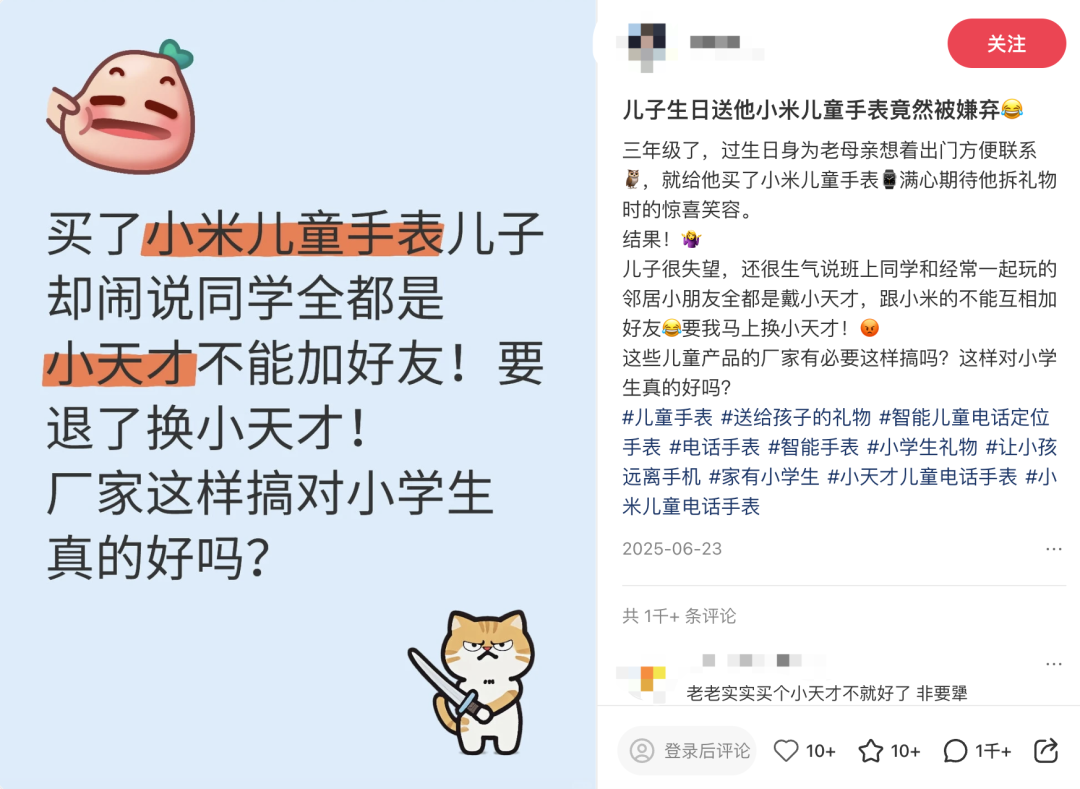 在一些“选小天才还是其他品牌”的社媒笔记下,就有家长表示,“只有用上小天才,才算融进了圈子”。有买了小米等其他儿童手表的家长提到,“儿子闹说同学全都是小天才不能加好友,要退了换小天才。”