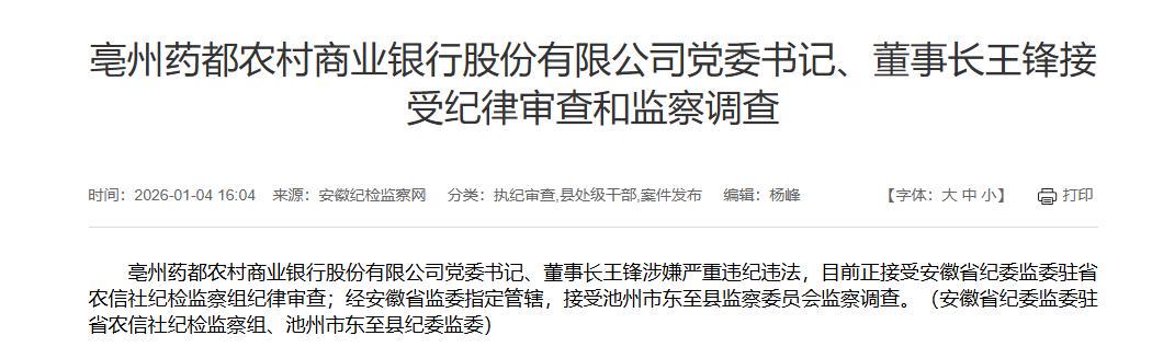 2026年首个工作日,银行业反腐传来首份通报。安徽亳州药都农村商业银行股份有限公司(下称“药都农商行”)党委书记、董事长王锋涉嫌严重违纪违法被查,成为新年首位落马的银行董事长。