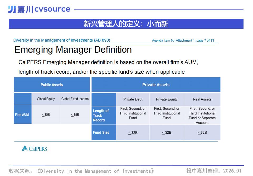 CalPERS并没有模糊处理,而是建立了一套清晰的量化标准。它对「新兴管理人」的定义如下:
