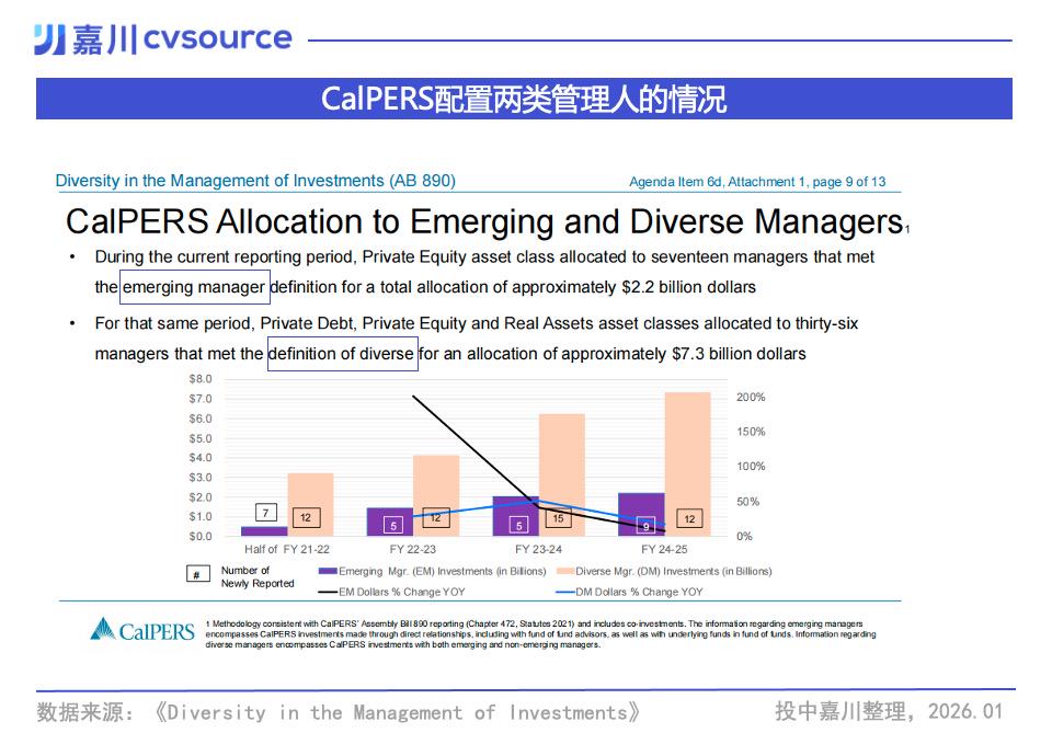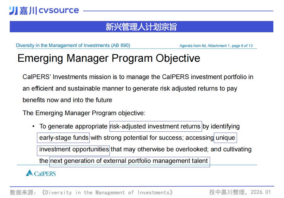 这一配置策略在CalPERS最近发布的《投资管理中的多元化报告》(AB 890)中被详细披露。文件介绍了如何通过布局“新兴管理人”与“多元化管理人”,在收益下行趋势下,寻找那些处于成长早期的投资团队,创造新的超额收益来源。