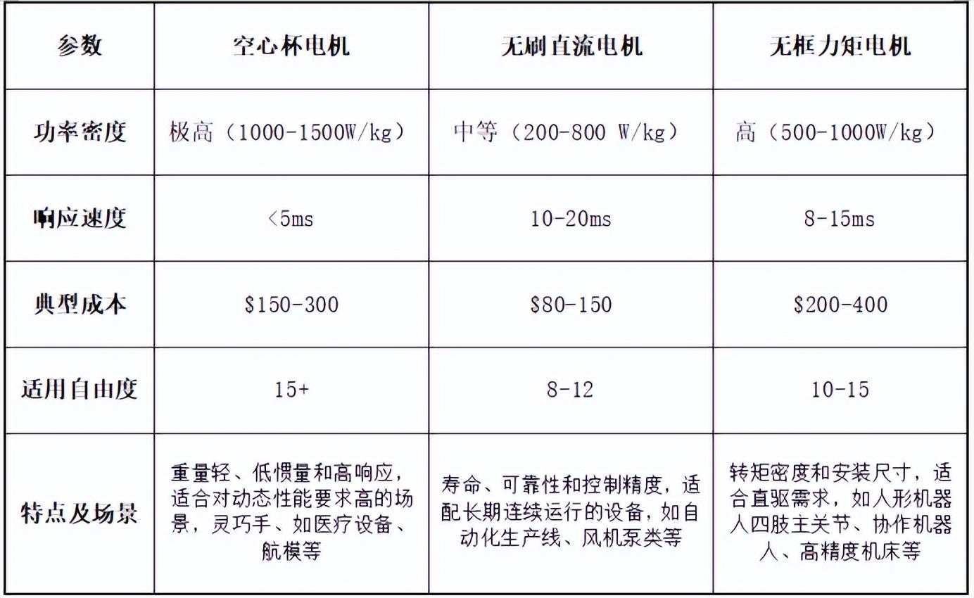 纵向对比来看,第一代有刷空心杯电机:早期应用于军事、航天等领域,结构简单但寿命受限,主要用于对体积和重量敏感的特殊场景;第二代无刷空心杯电机:通过电子换向取代机械电刷,寿命大幅提升,噪声降低,逐步进入医疗设备、精密光学仪器等领域;第三代高性能集成化空心杯电机:结合高性能磁材、精密绕线工艺与集成驱动控制,进一步优化功率密度与响应特性,满足人形机器人、协作机器人、高端无人机等新兴领域的需求。