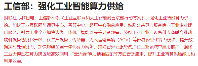 盘后工信部印发《工业互联网和人工智能融合赋能行动方案》,强化工业智能算力供给。加快工业互联网与通算中心、智算中心、超算中心融合应用,鼓励公共算力服务商向工业企业提供服务。引导工业企业加快边缘一体机、智能网关等设备部署。