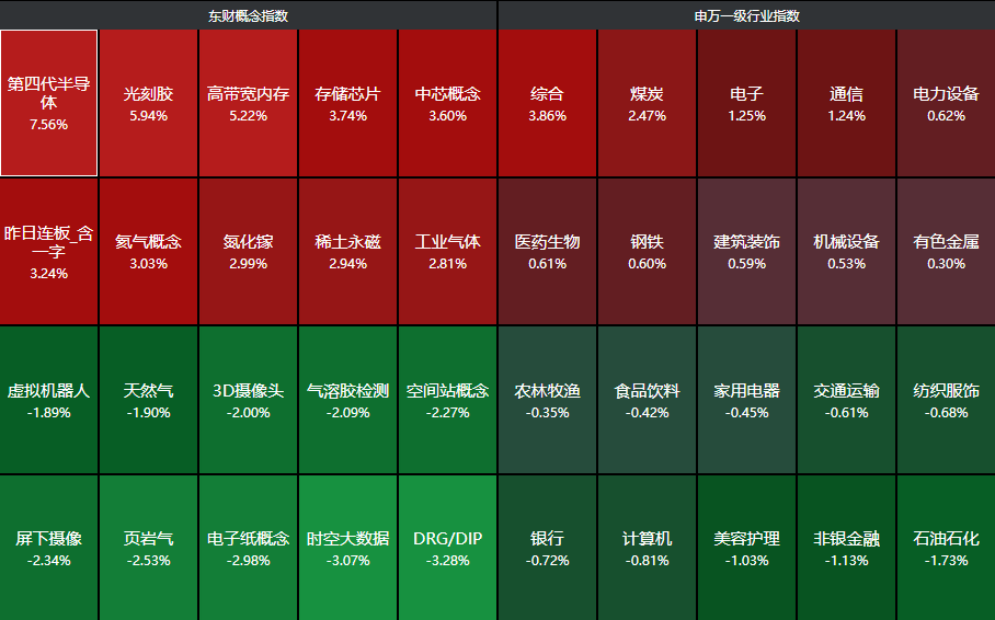 分行业来看,综合、煤炭、电子、通信、电力设备等行业领涨,石油石化、非银金融、美容护理、计算机、银行等行业领跌。