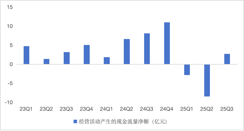 2025年前三季度,公司经营活动现金流净额为-8.65亿元,且恶化趋势逐季扩大。