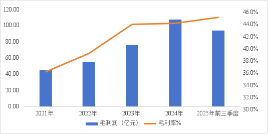 受益于较高的海外业务占比和强品牌溢价,安克维持了良好的盈利能力。2022-2024年,公司毛利润从54亿元增长至106亿元,CAGR高达40.4%,同期毛利率从37.9%上升至43.1%,2025年前三季度进一步提升至45.2%。