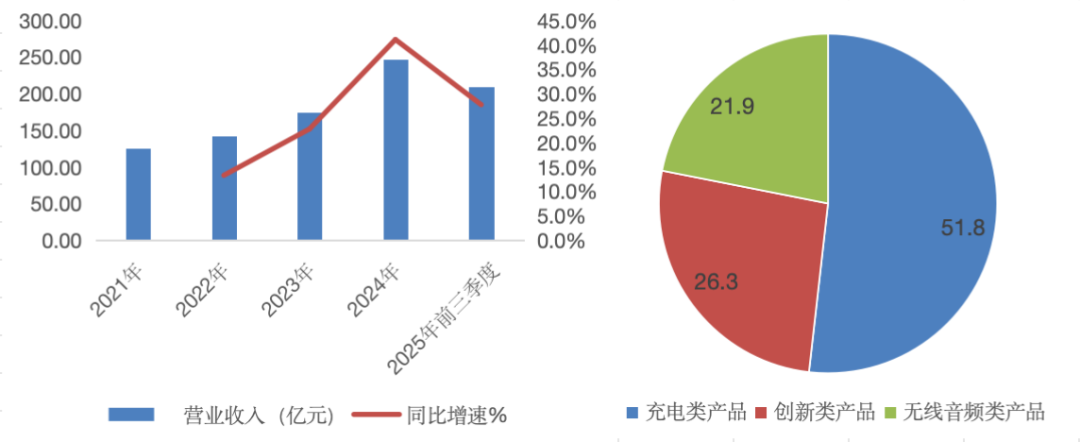 2022-2024年,安克创新的总收入从143亿元增长至247亿元,年均复合增速31.7%,25年前三季度公司累计营收210.2亿元,同比增长27.8%,整体维持较高的成长性。