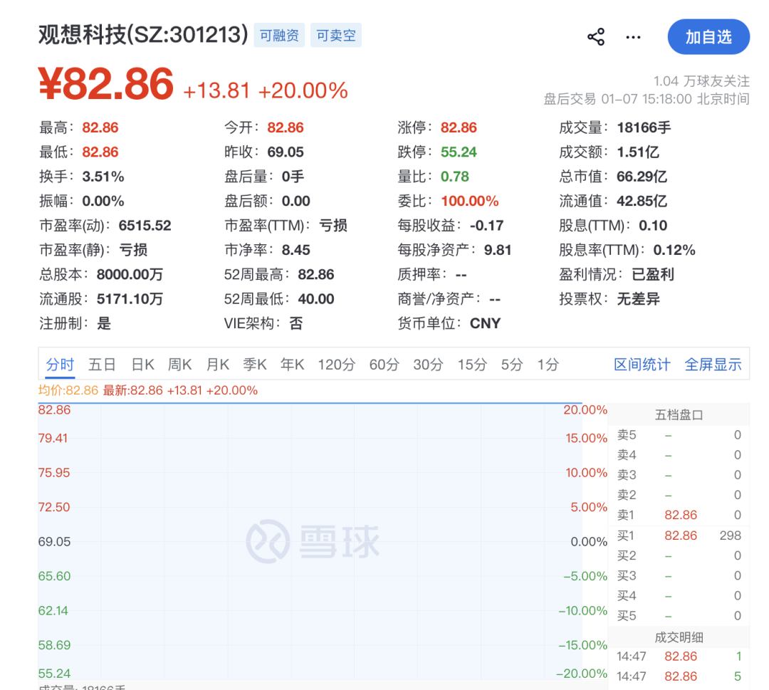 今日,观想科技开盘即封停,涨20%,报82.86元/股,市值为66.29亿元。