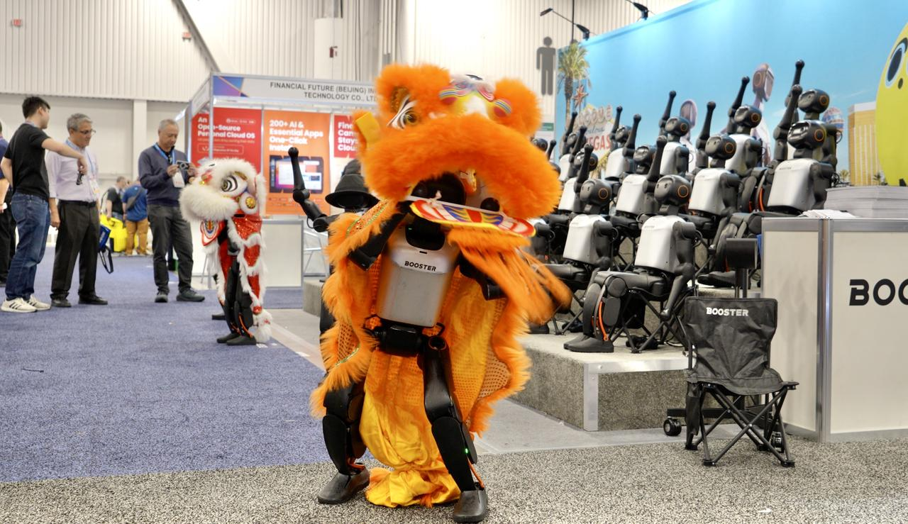 在加速进化展台,数十台Booster K1组成机器人矩阵亮相。机器人同步完成集体扭头注视、挥手问好、齐舞表演等系列动作,吸引众多海内外参观者驻足观看。融合了中国传统文化的醒狮表演更成为亮点。
