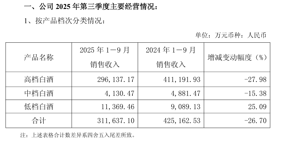 据了解,高档产品是口子窖的核心收入来源。以2025年前三季度为例,其高档白酒销售收入为29.6亿元,占酒类总收入的比重高达95%,但这部分产品收入同比下降27.98%,在所有产品中收入下降最显著,从而导致整体业绩下滑。
