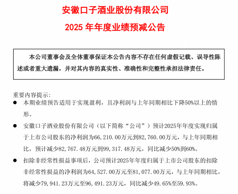 1月7日晚间,安徽白酒企业口子窖发布2025年度业绩预告,预计归属于上市公司股东的净利润为6.62亿元至8.28亿元,同比减少50%到60%。扣除非经常性损益后的净利润为6.45亿元至8.11亿元,同比减少49.65%至59.93%。