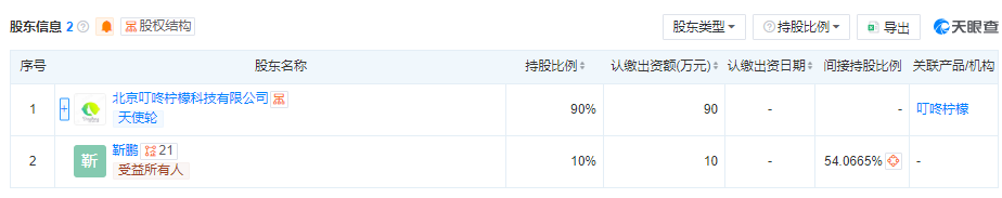 股权信息显示,这家公司由叮咚柠檬科技持股90%,靳鹏持股10%。