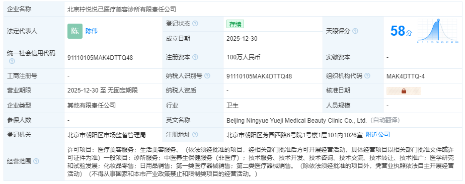 最近,一家名为北京柠悦悦己医疗美容诊所有限责任公司的成立,引发了不少人的关注。