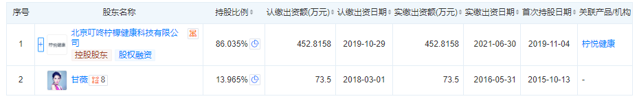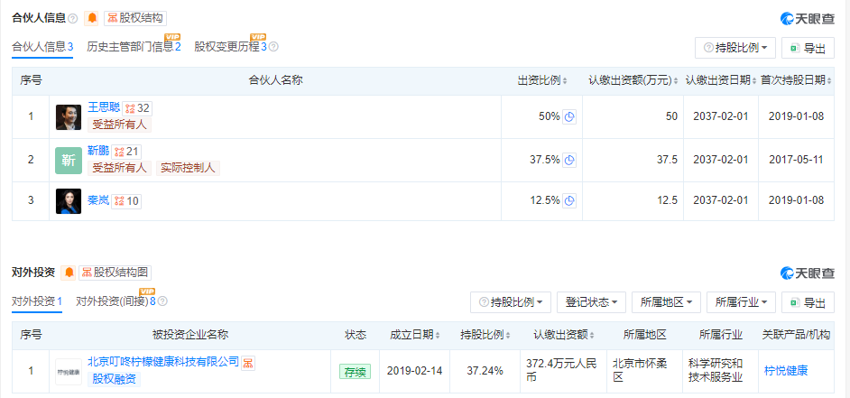 王思聪和知名演员秦岚,则通过柠悦科技间接持有叮咚柠檬的股份。