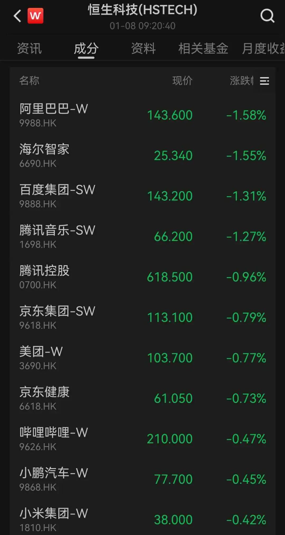1月8日,恒生指数开盘跌0.59%,恒生科技指数跌0.44%。