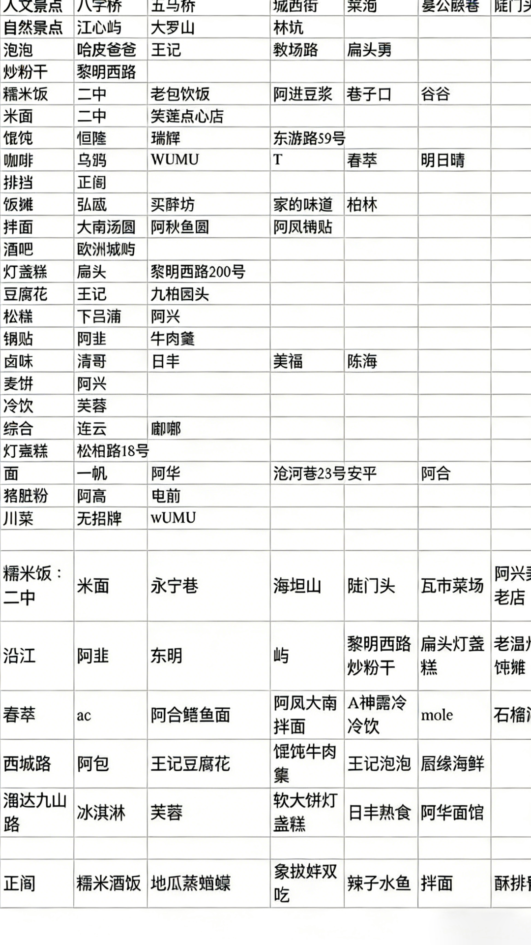 最近的元旦假期,我去温州台州旅游,选择了打卡特色小吃版citywalk路线。拿着当地朋友甩来的Excel表,横轴是所在街道区域,纵轴是小吃分类及店名,当别人还在苦哈哈找线索寻宝时,我打个车就到,堪称降维打击。