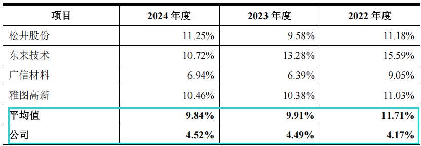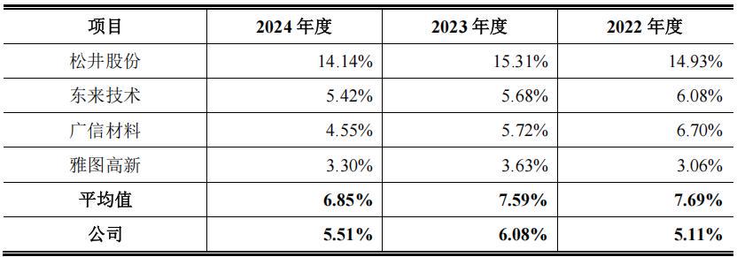 金桥德克研发费用分别为2,511.18万元、3,276.96万元和3,454.62万元,占当年营业收入比例分别为5.11%、6.08%和5.51%。公司研发费用率均低于同行业可比公司平均水平7.69%、7.59%和6.85%。