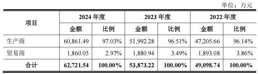 金桥德克客户按照性质可区分为生产商和贸易商。公司销售客户类型以生产商为主,报告期各期,公司对生产商的收入占整体主营业务收入的比例分别为96.14%、96.51%和97.03%。