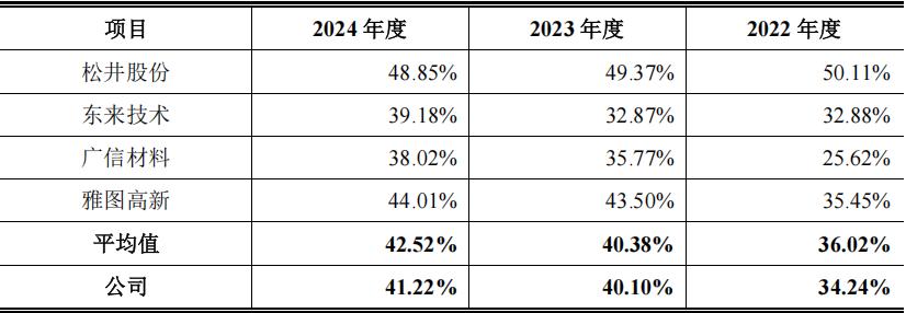报告期内,公司主营业务毛利率分别为34.23%、40.10%和41.23%。与可比公司均值相比,公司主营业务毛利率略低亦较接近。