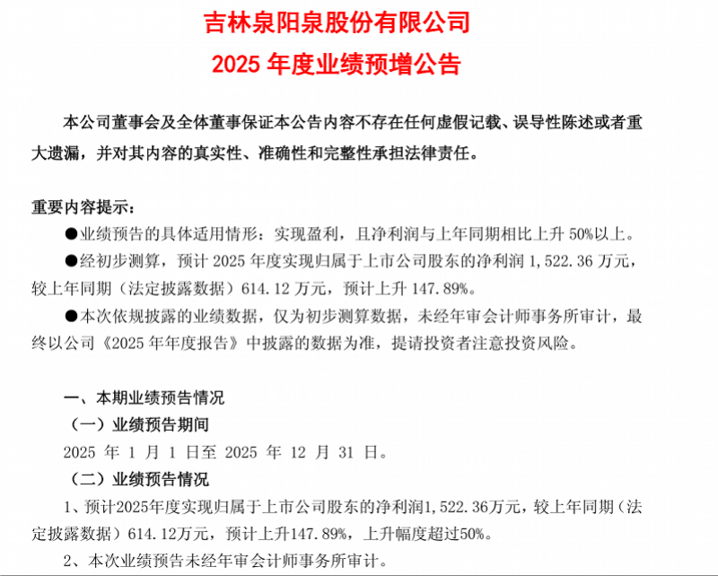 同时,这意味着泉阳泉2025年第四季度的净利润预计亏损945.02万元。