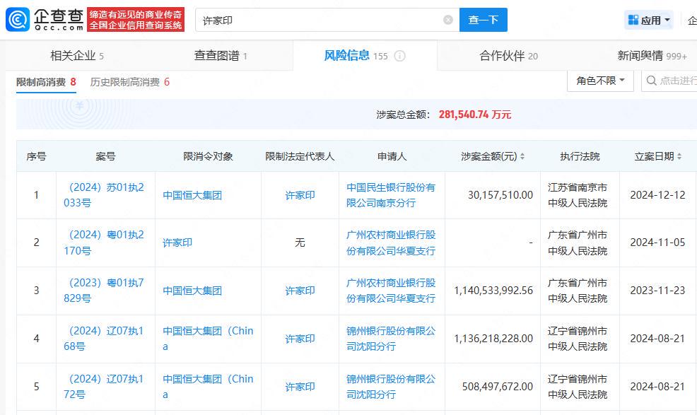 企查查APP显示,近日,许家印新增一则被执行人信息,执行标的4700万元人民币,执行法院为北京金融法院。截至目前,许家印被执行总金额已超30亿元,同时关联多起限制消费案件,其高消费及非生活和工作必需的消费行为已被多次限制。