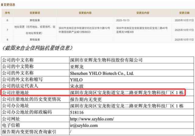 其次是地理与资本的“近距离”关联。本报记者查询企信网发现,脑机星链的注册地址位于“深圳市龙岗区宝龙街道宝龙社区宝龙二路40号亚辉龙1#楼309”,与上市公司办公地址高度重合,且该地址是脑机星链在2025年10月17日(成立后一个半月)变更而至。此外,亚辉龙通过参股公司间接持有脑机星链4%的股权。这种办公地址的毗邻与股权上的微弱关联,使得这场对外战略合作,隐约带有几分“内部孵化”或“关联方协同”的色彩,而非市场化筛选下的强强联合。