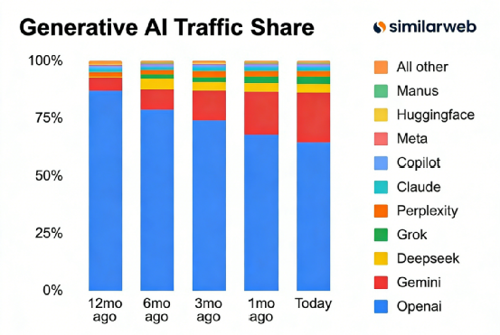 生成式AI网站全球流量份额发生了较大变化:chatgpt份额跌破65%,Gemini份额超过20%,Grok超过3%,并正接近 DeepSeek。昨晚谷歌涨超2%,时隔七年市值超过苹果。