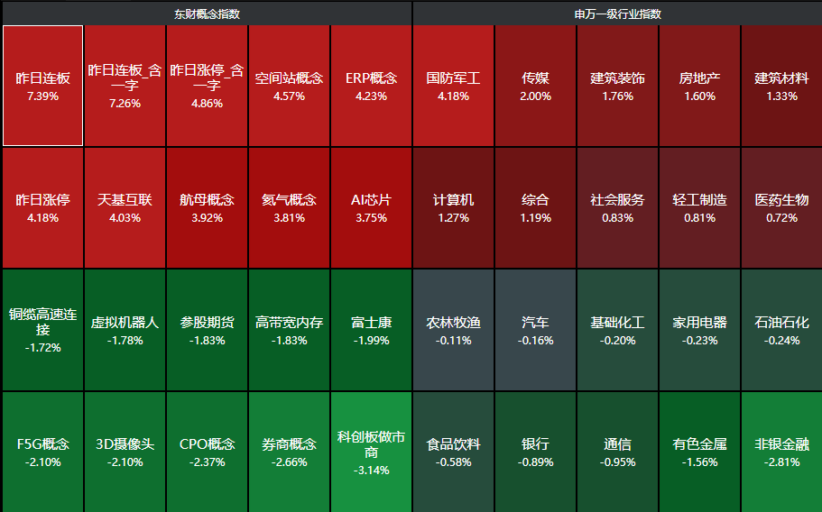 分行业来看,国防军工、传媒、建筑装饰、房地产、建筑材料等行业领涨,非银金融、有色金属、通信等行业领跌。