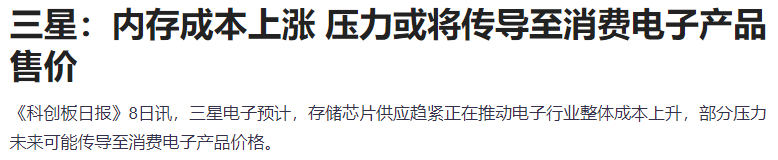 三星电子预计,存储芯片供应趋紧正在推动电子行业整体成本上升,部分压力未来可能传导至消费电子产品价格。