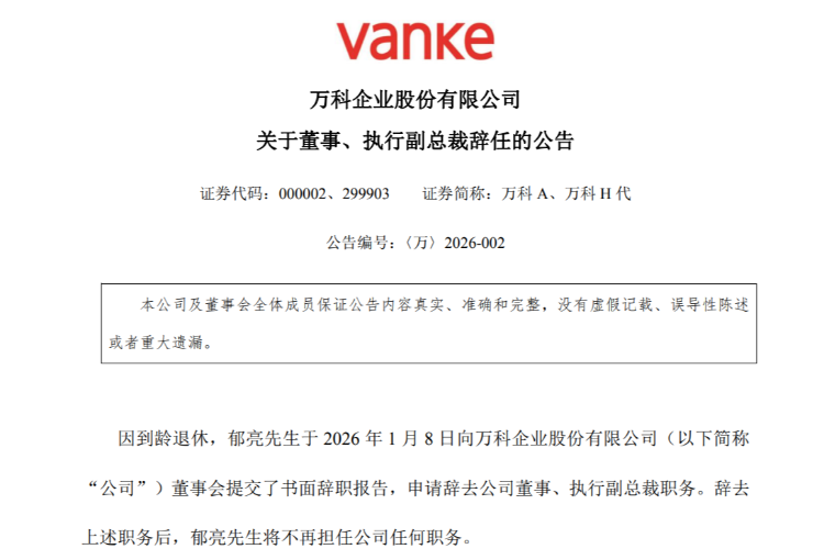 2026年1月8日,万科一纸公告为郁亮的35年职场长跑画上句点。因到龄退休,郁亮向董事会提请辞去全部职务,即日起不再担任公司任何岗位。公告同时强调,郁亮的辞职不会影响公司董事会的正常运作和公司的日常经营,公司董事会将按照法定程序尽快完成董事的补选工作。郁亮持有公司股票739.49万股,将继续遵守相关减持规定。