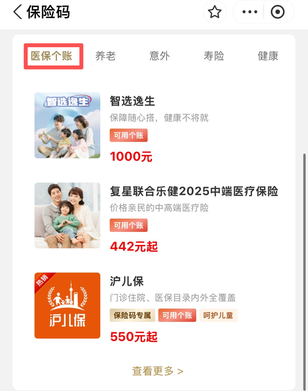 在菜单栏中,我们可以看到有单独的一栏叫「医保个账」;这个栏目下的产品都可以用我们自己的医保个账余额来支付。