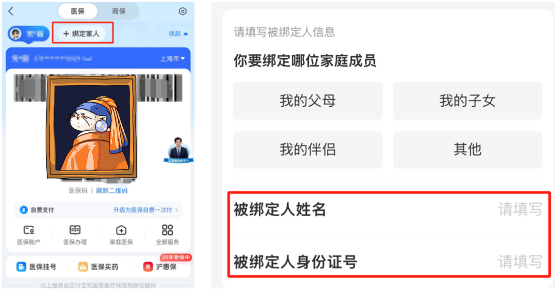 第二步:点击「绑定家人」,输入家人的身份信息。