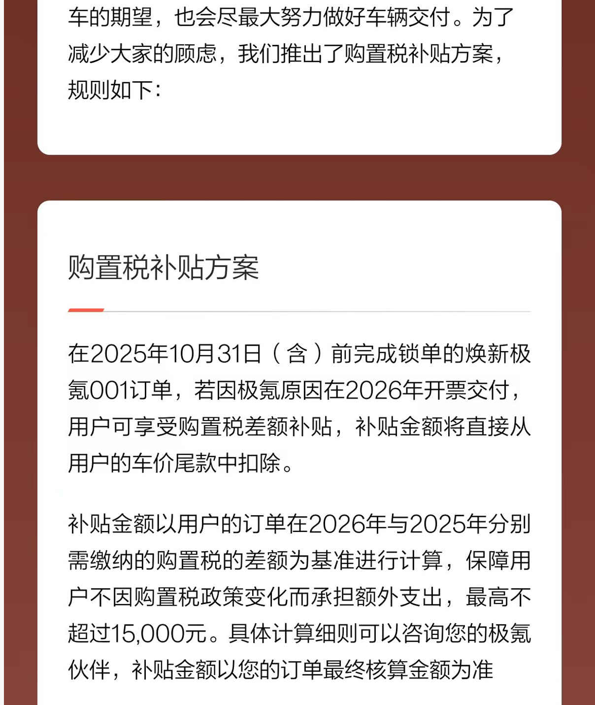 据介绍,极氪提供两种解决方案:对于2025年内下单,因极氪原因导致车辆未能在2025年12月31日前运抵车主所在城市的订单,车主可正常享受购置税兜底政策;对于车辆已在2025年12月31日前运抵,但因用户个人原因未能在年内完成付款开票及提车的订单,则无法适用上述兜底政策。相关车主可享受极氪在2026年1月公布的对应车型购置税补贴权益。