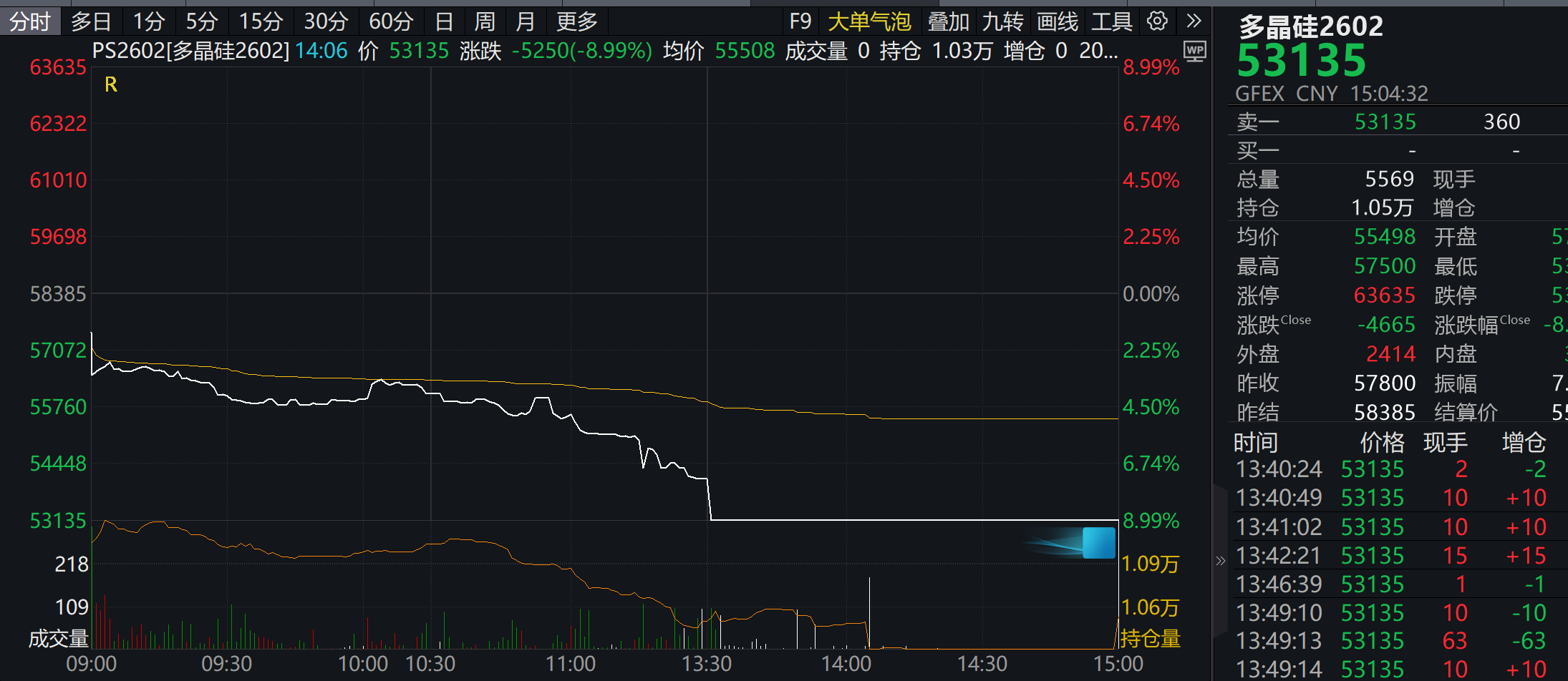 上述消息扩散后,多晶硅期货午后陷入跌停。截至1月8日收盘,多晶硅2602、2603、2604、2605分别报收5.31万元、5.34万元、5.35万元、5.36万元。