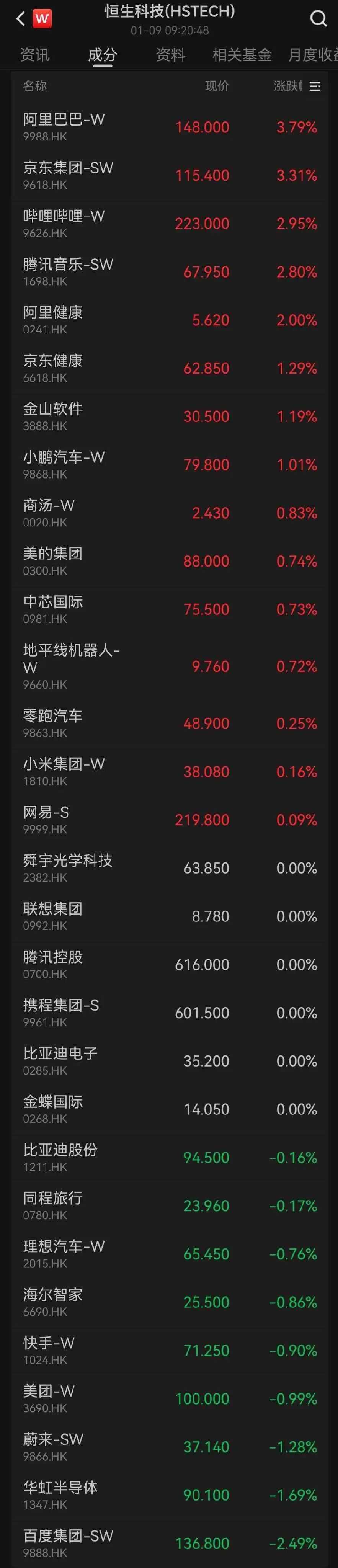 科网股多数上涨,阿里巴巴、京东集团涨逾3%,哔哩哔哩、腾讯音乐、阿里健康涨逾2%;百度集团跌超2%。