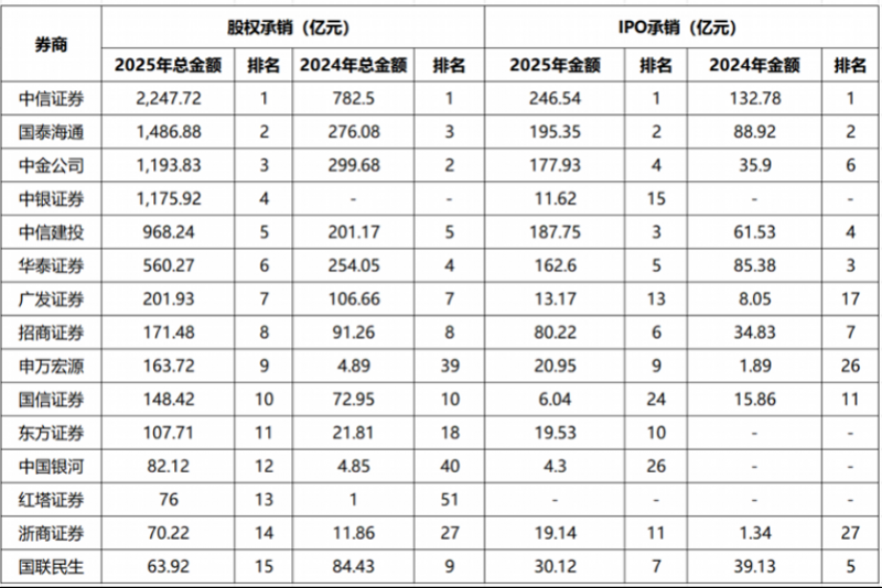 在市场关注度较高的IPO承销领域,2025年,中信证券、国泰海通A股IPO承销金额分别以246.5亿元、195.4亿元位居前二;中信建投、中金公司、华泰证券分列第3至第5,承销金额均超160亿元,大幅领先第6名的招商证券(80.22亿元),头部效应明显。