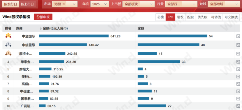 2025年,“国际化”成为证券行业关键词,随着港股上市热潮涌动,多家券商港股IPO承销规模实现翻倍式增长。其中,中金国际全年承销港股IPO项目641.28亿元,同比增长1.9倍,继续占据市场第一;中信里昂、华泰金控香港、中信建投国际、国泰君安国际、广发证券香港承销金额分别为440.42亿元、231.2亿元、89.32亿元、83.55亿元、60.15亿元,跻身市场前10,同比分别增长7.5倍、3.8倍、2.4倍、8.4倍、2.1倍。