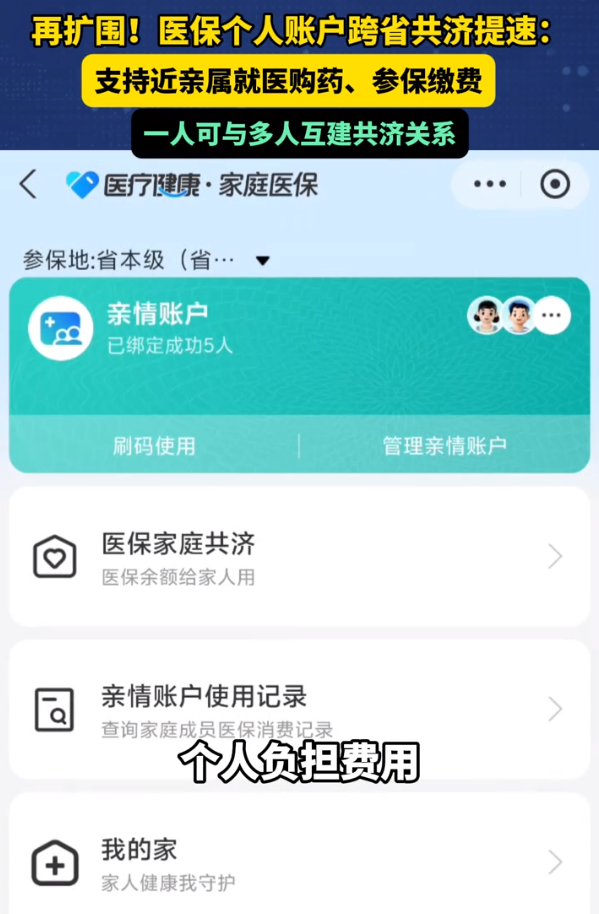 这次的目标是将共济范围扩展至全国。也就是说你在工作地交的职工医保,个人账户里面的钱,可以给全国任何地方的8类亲属使用。