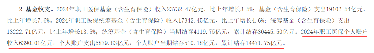 根据国家医保局的数据,截至2024年底,职工医保参保37948.34万人,职工医保个人账户累计结存14471.75亿元。也就是说这1.45万亿资金放在这里完全动不了,发挥不了作用,太浪费了。
