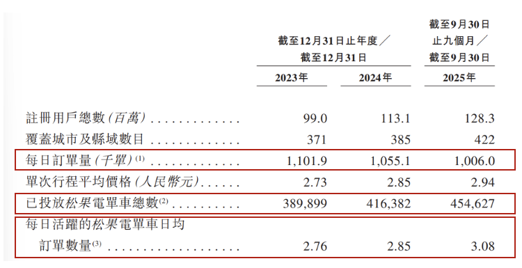 深入到业务层面,根据招股书数据,2025Q3公司单次行程价格为2.94元,同期松果电单车每日平均订单数量为3.08单,这意味着一辆松果电单车一年能产生的收入预期为3305元(365天*2.94元*3.08单)。