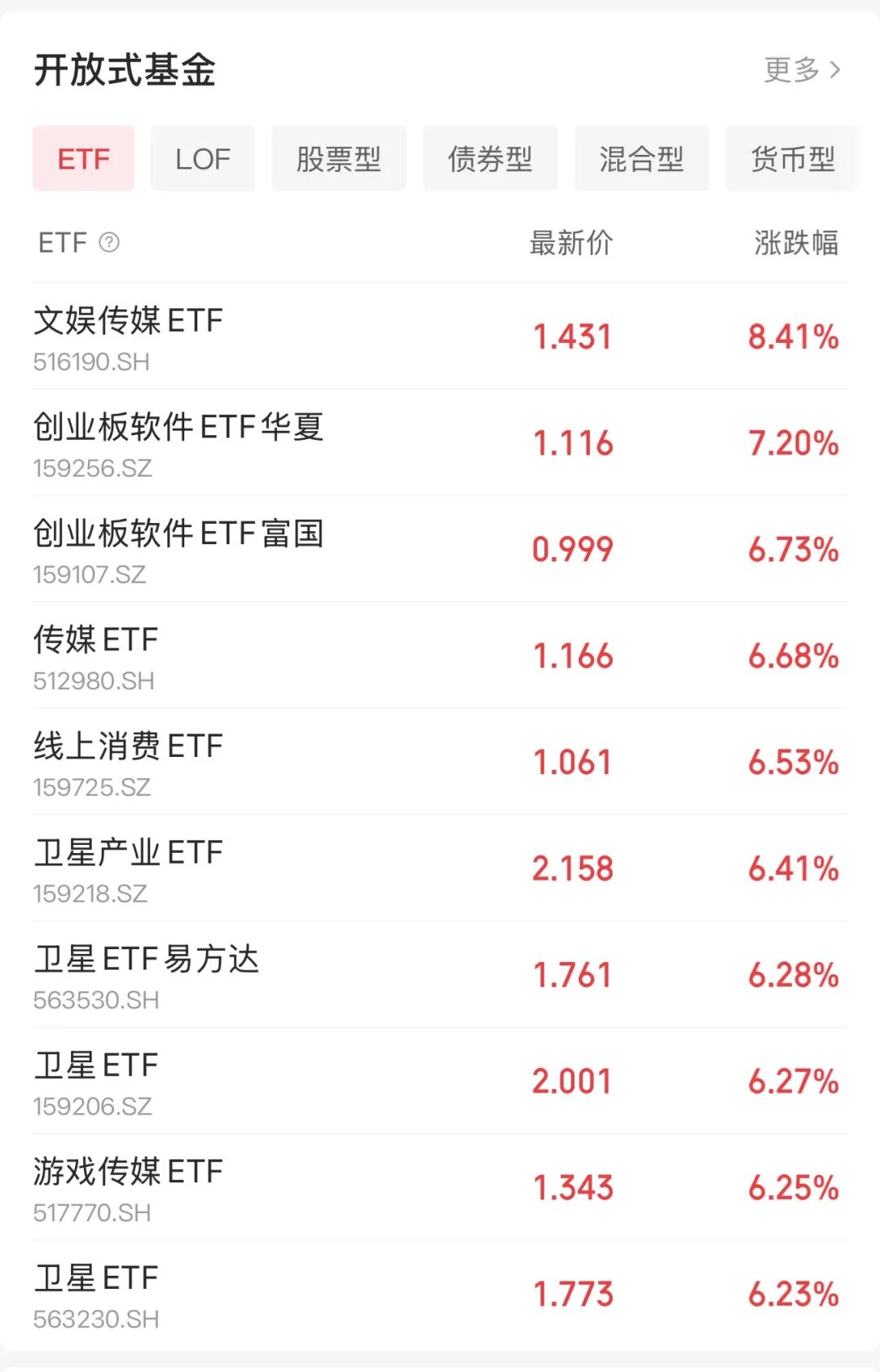 从ETF涨幅榜来看,传媒和卫星相关ETF涨幅靠前。