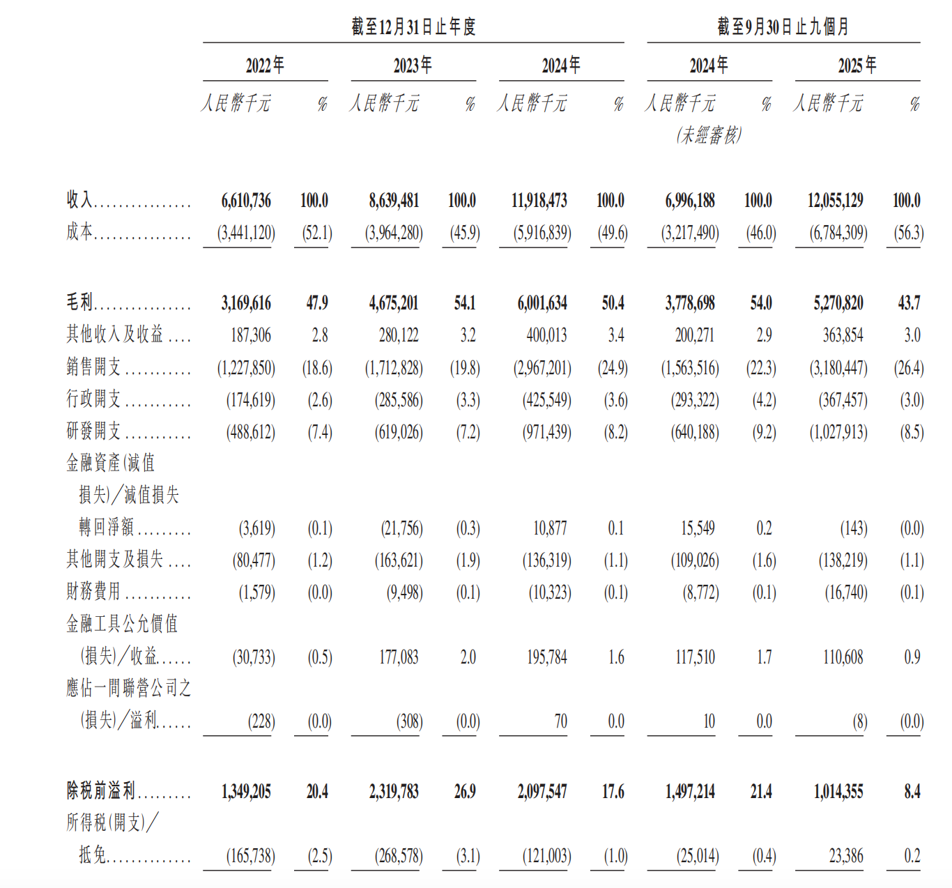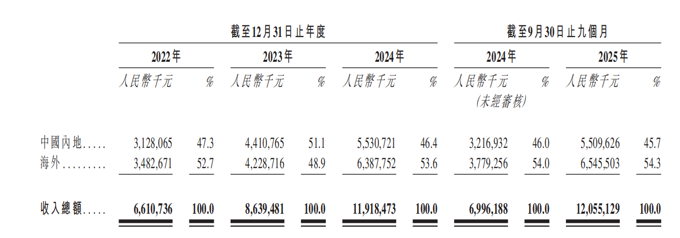 公开资料介绍,石头科技成立于2014年,是国内扫地机器人龙头企业之一,2020年正式登陆科创板,此次冲击港股为其二次上市,如若顺利,石头科技将成为“A+H”上市公司。从业绩来看,招股书显示,2022年至2024年,石头科技分别实现营收66.11亿元、86.39亿元和119.18亿元,2025年上半年,营收达到120.55亿元,较之2024年同期的69.96亿元同比增长72.3%,收入呈现逐年增长态势。