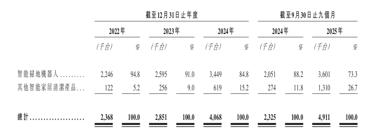 其他智能家居清洁产品则主要包括洗地机和洗烘一体机,招股书显示,这部分营收在2022年至2024年间依次为2.65亿元、5.54亿元及10.7亿元,去年三季度增长到21.9亿元,占比提升至18.2%,另外,销量也由2022年的12.2万台增长至2025年前三季度的131万台。