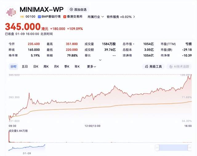 2026年1月9日,这家国产大模型领域的明星公司——上海稀宇科技(MiniMax)正式在港交所挂牌上市。其以165港元/股的发行价,成功募集资金超48亿港元。上市首日股价大幅高开,盘中一度飙升超过80%。截至今日收盘,股价报收345港元/股,较发行价暴涨109.09%,公司总市值随之跃升至1054亿港元。