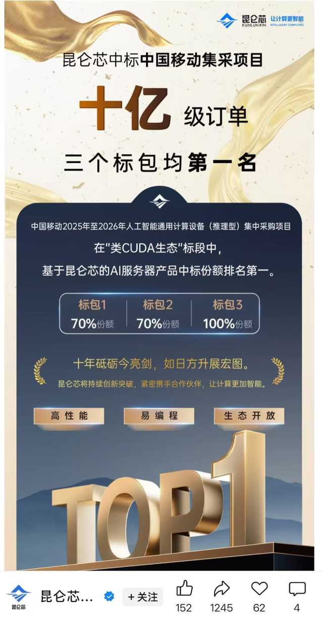 昆仑芯官方微信公众号置顶的两条内容之一是昆仑芯在中国移动2025年至2026年人工智能通用计算设备(推理型)集中采购项目十亿级订单三个标包均第一名,其中标包1,70%份额;标包2,70%份额;标包3,100%份额。这被视为国产AI芯片在国家级基础设施领域的重要突破。