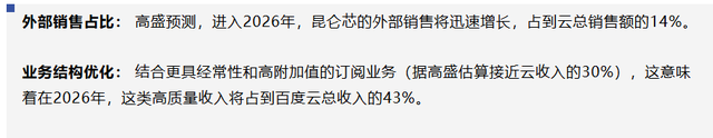 高盛分析道,2026年其外部销售收入将占百度云总销售额的14%。叠加接近云收入30%的高附加值订阅业务,高质量收入占比将达43%,显著提升盈利可持续性。