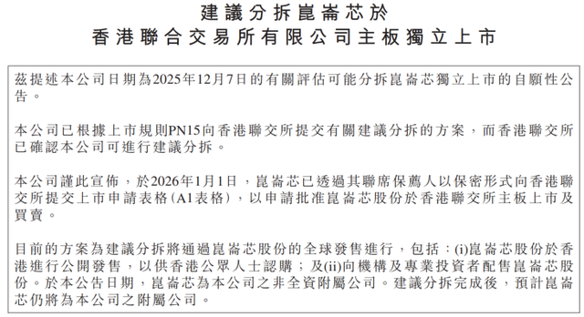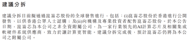 根据公告,目前的方案为建议分拆将通过昆仑芯股份的全球发售进行,包括在香港进行公开发售以供公众认购,以及向机构及专业投资者配售。